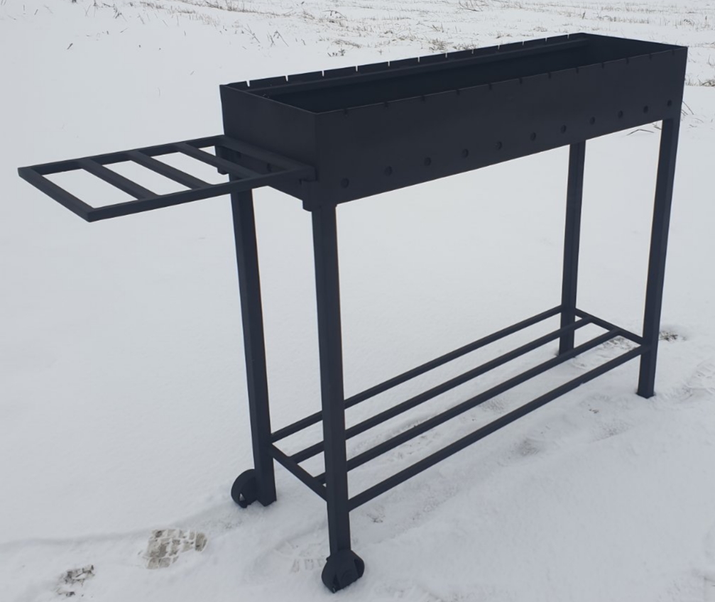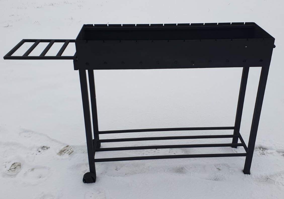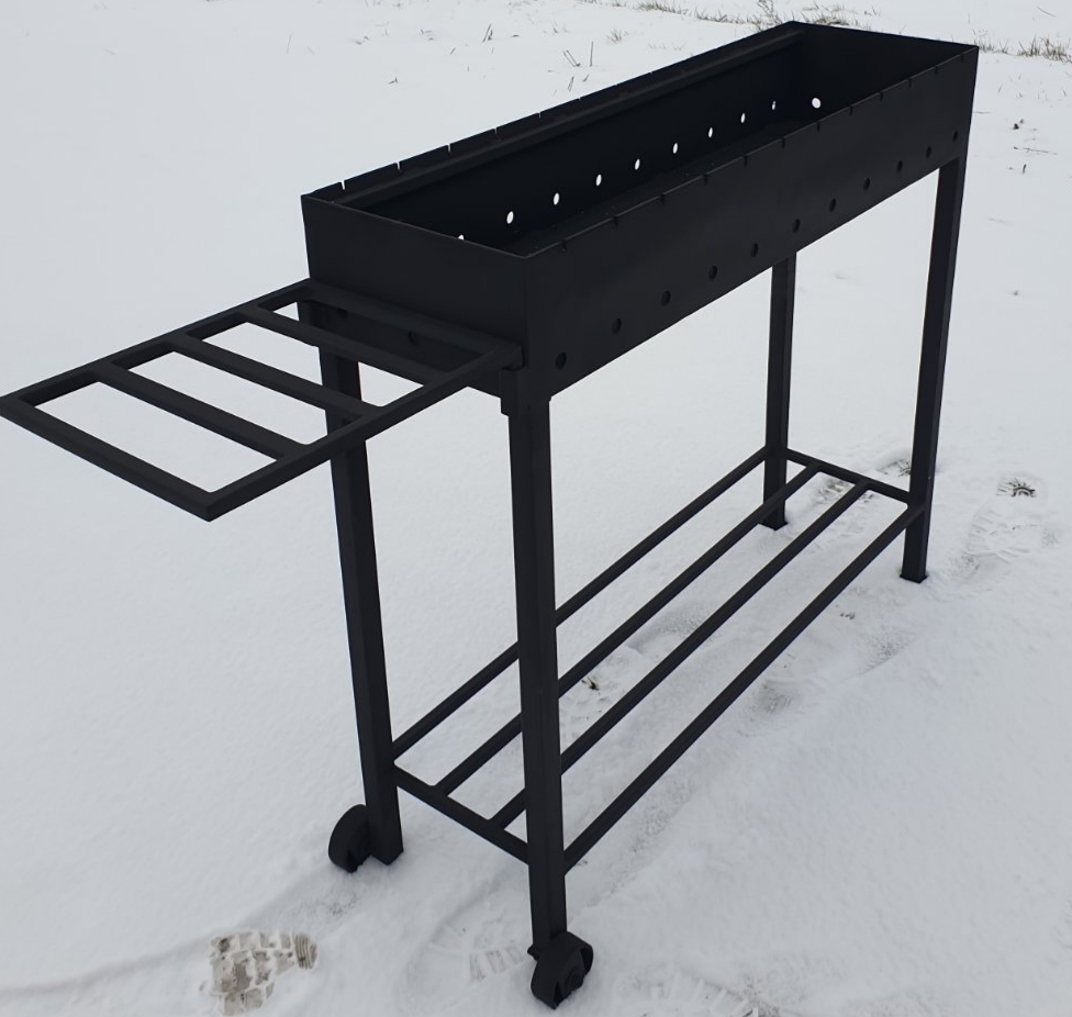 Размер чаши 1000х300х150.Толщина металла 4мм - 290р, 5мм - 330р. Изготовлен из металла толщиной 4 или 5 мм, мангал обрамлен по кругу профильной трубой 15х15х1,5, основание профильная труба 30х30х1,5 с дровницей из профильной трубы 15х15х1,5, предусмотрена одна боковая съемная полка из профильной трубы 15х15х1,5. Для удобства перемещения предусмотрены колесики.