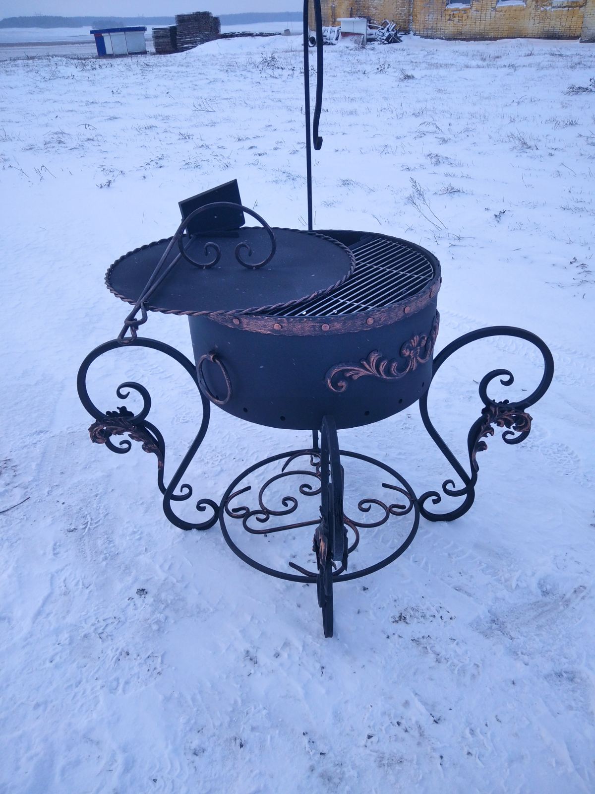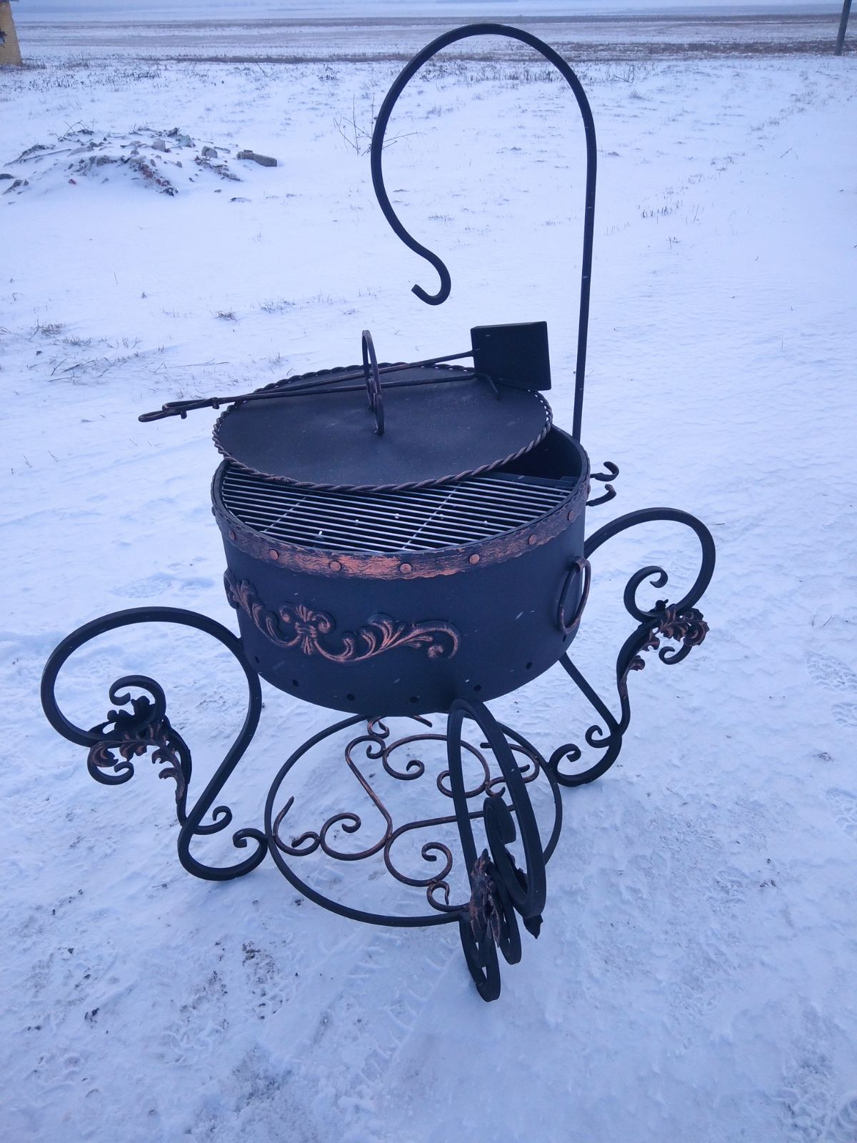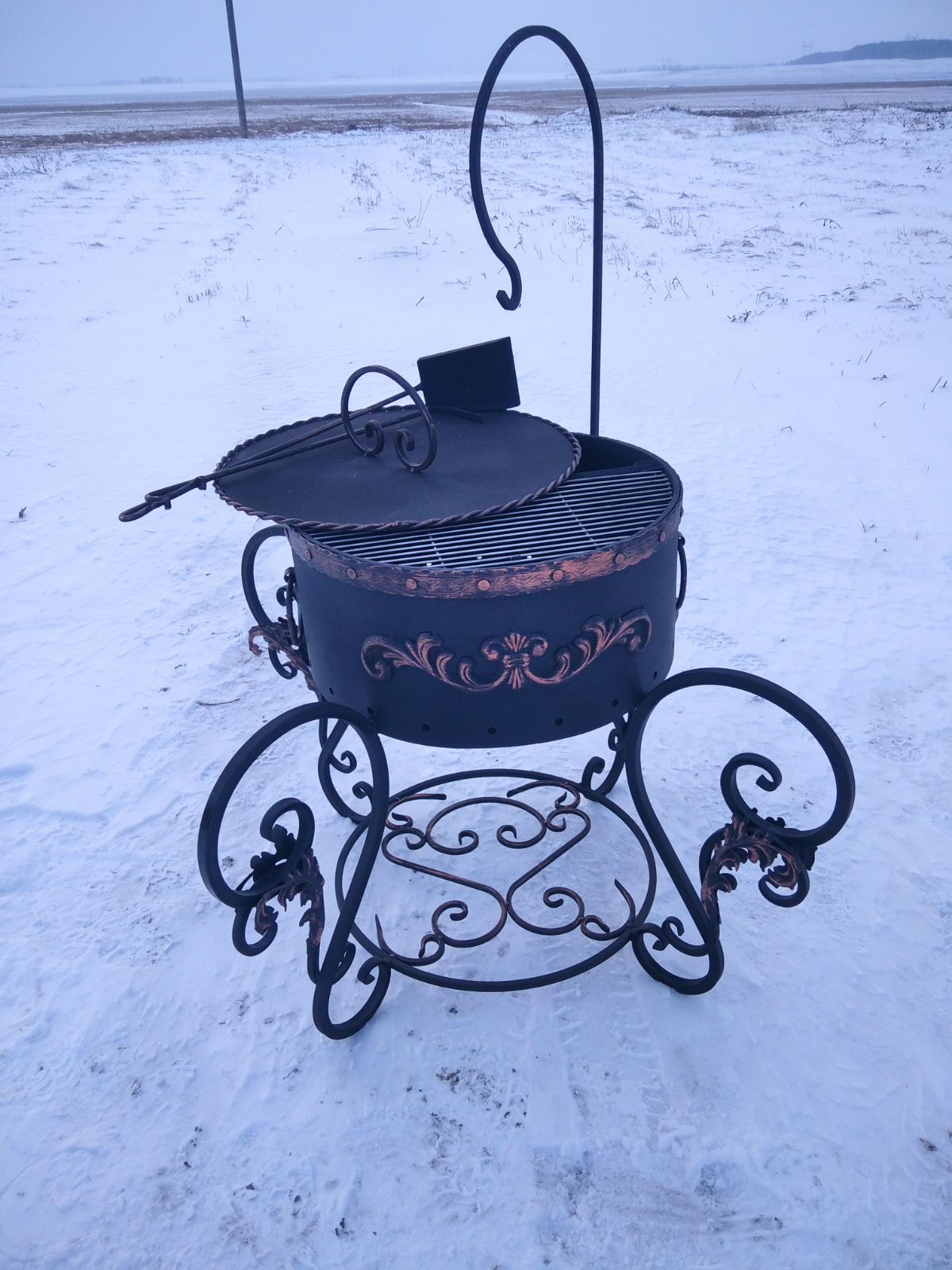 Декоративный очаг для зоны отдыха вашего сада. Круглый мангал-барбекю-кострище с крышкой, решеткой для барбекю (изготовленной из пищевой нержавеющей стали d-4мм), с регулируемым по высоте подвесом под котелок, с кованой кочергой и совком в комплекте. Толщина металла 8 мм. Диаметр чаши составляет 650 мм ,высота чаши 300 мм.