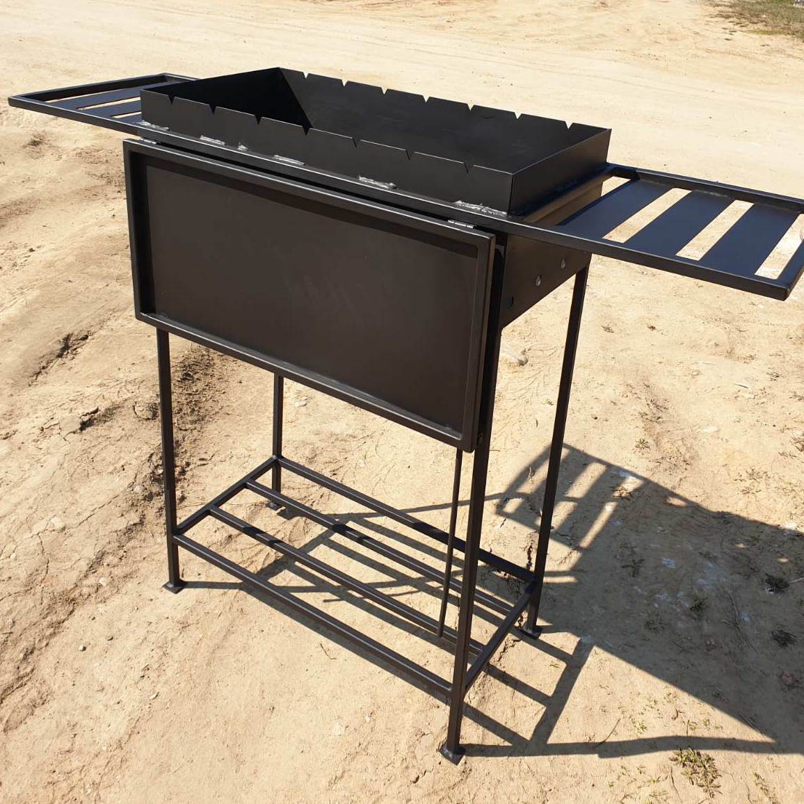 Размер чаши 600х300х200, изготовлен из металла толщиной 2 мм, мангал обрамлен по кругу профильной трубой 15х15х1,5, основание профильная труба 15х15х1,5 с дровницей, предусмотрено две дополнительные полки + откидная передняя полка